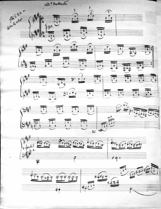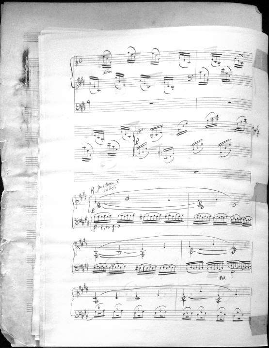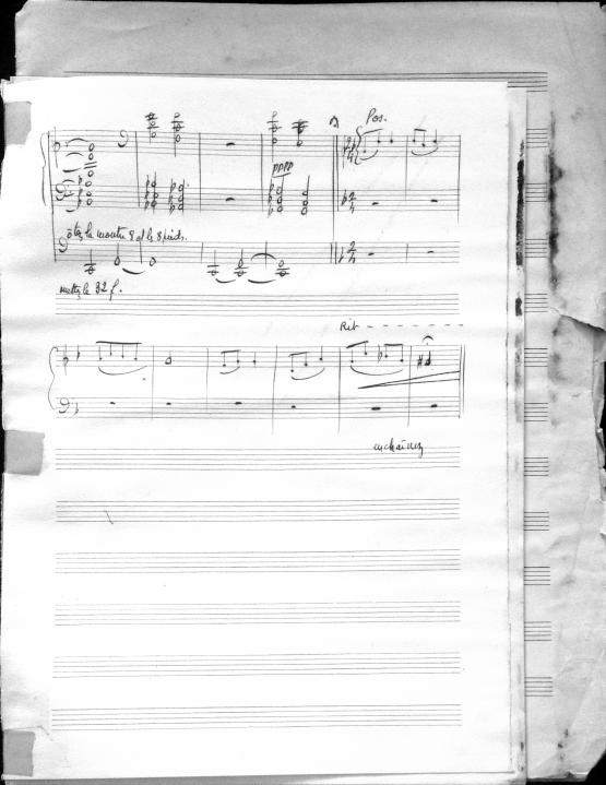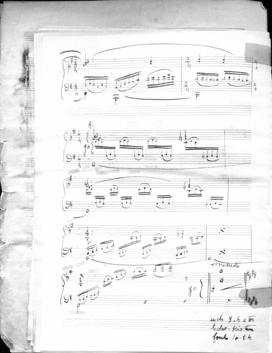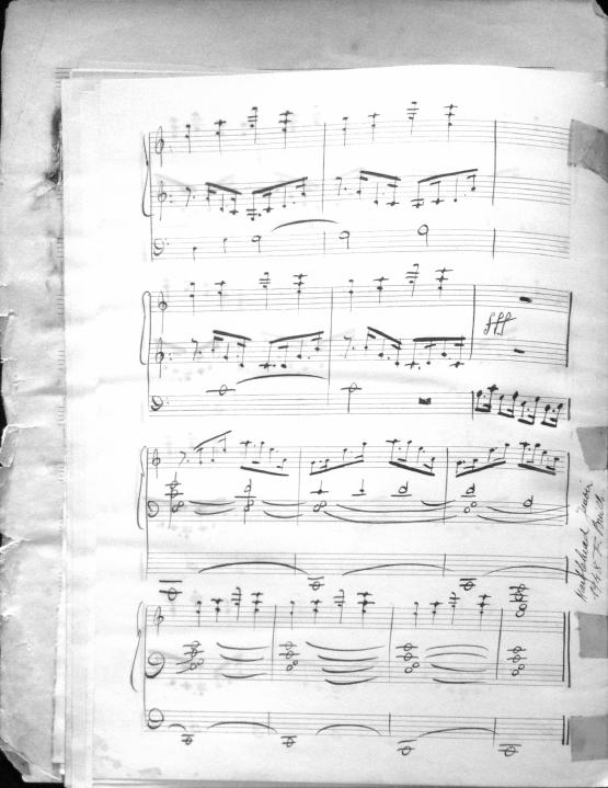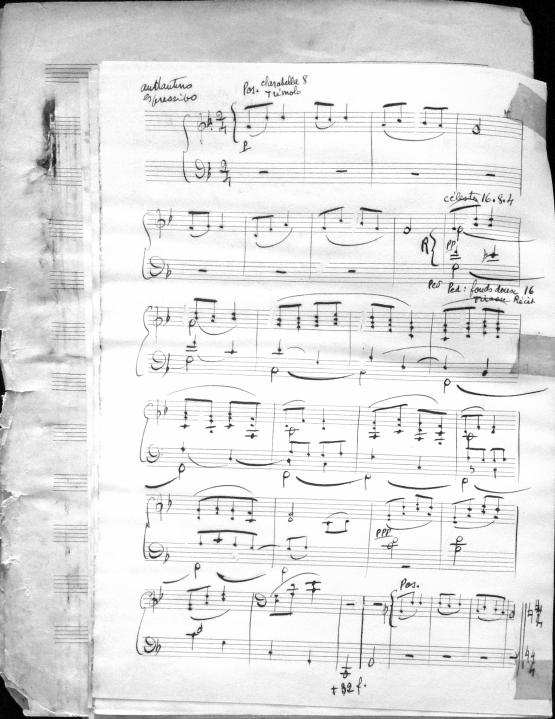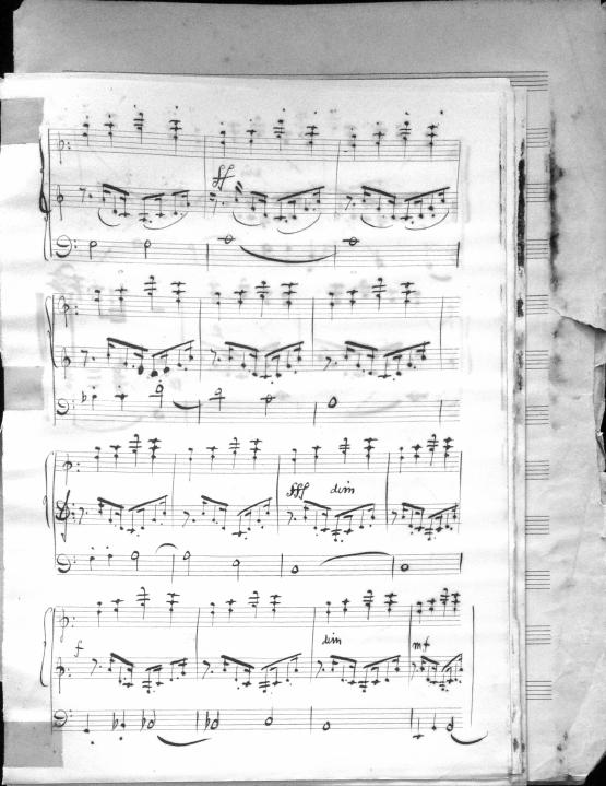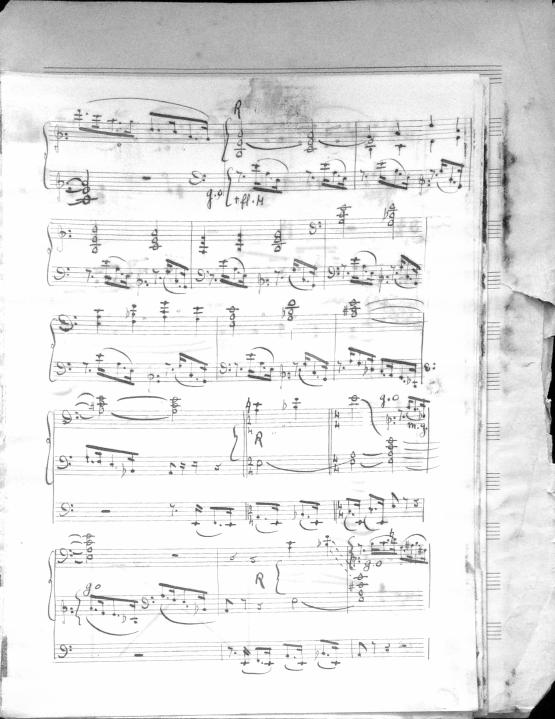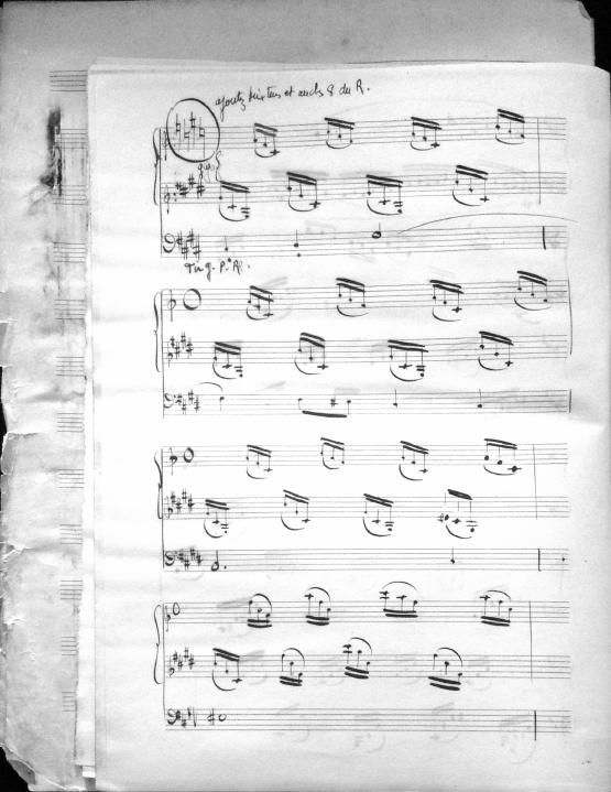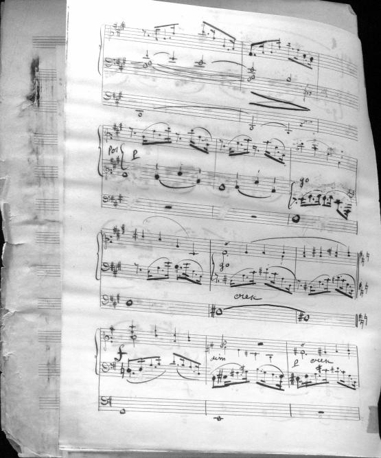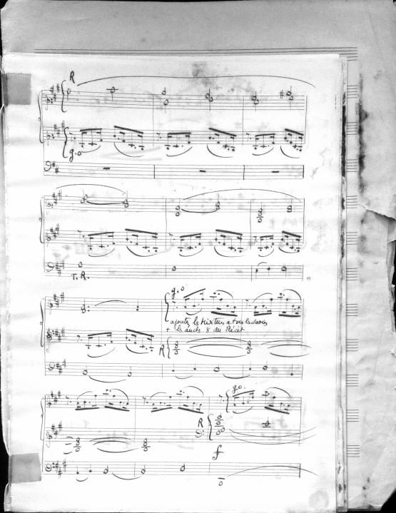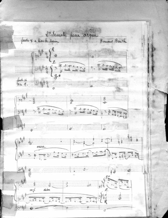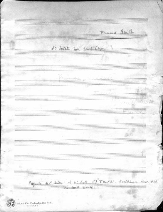 Movements are written in pencil on the front of the score. The manuscript has water damage. Decruck writes her name as "Fernand Breilh"
