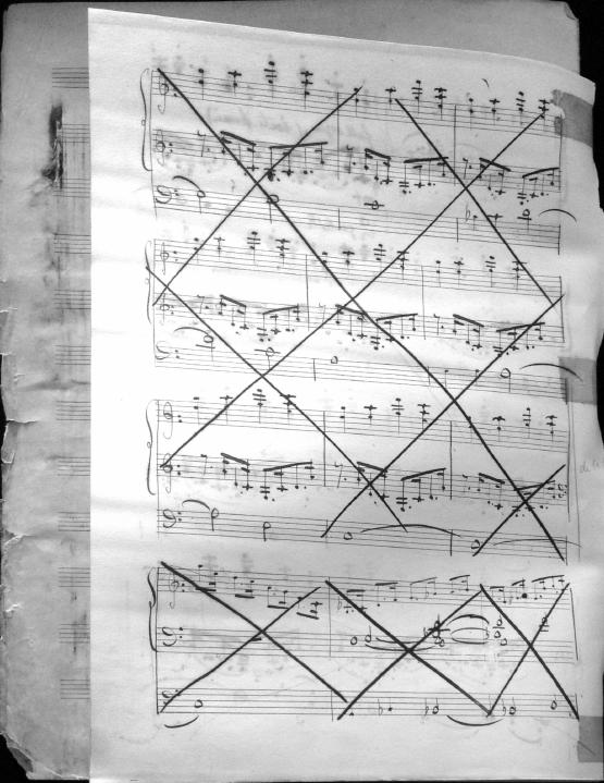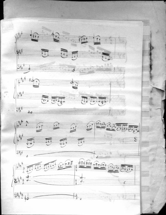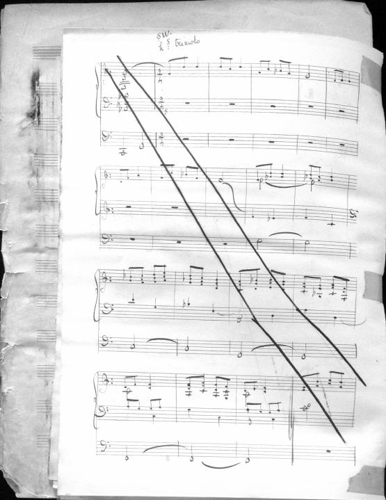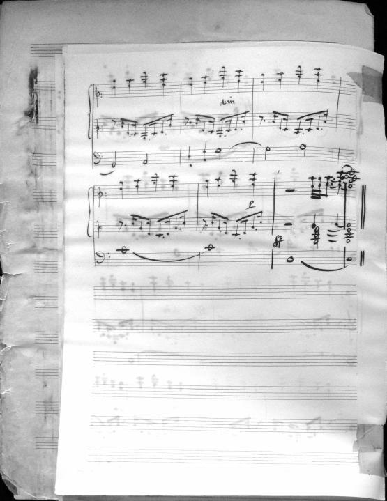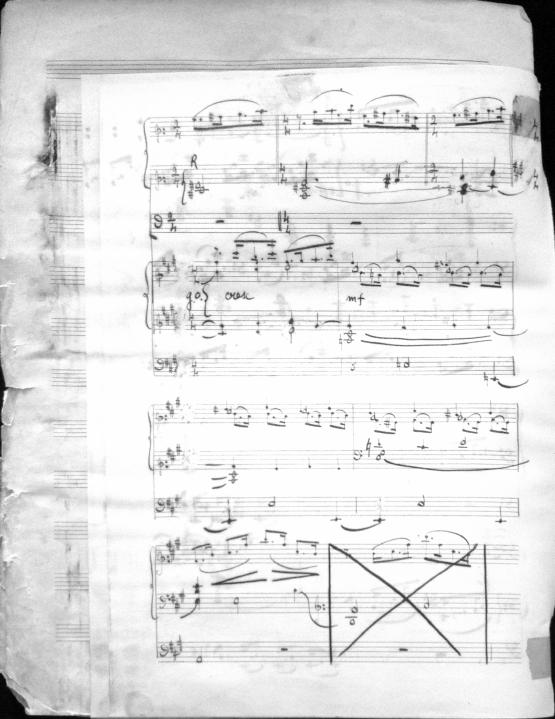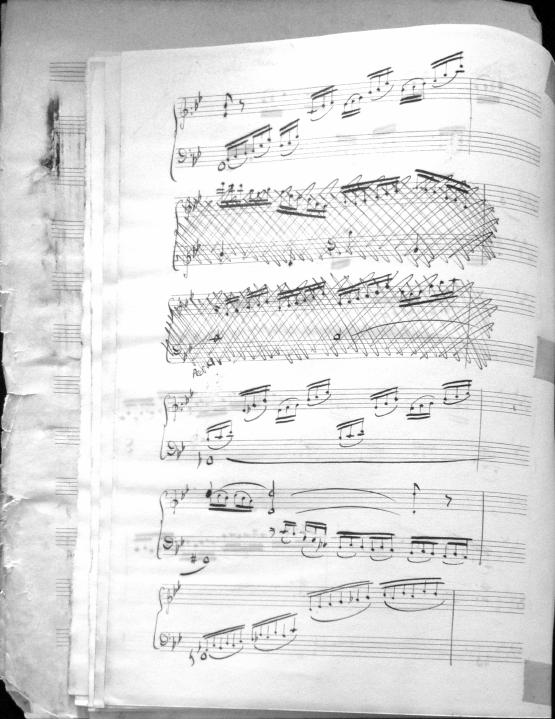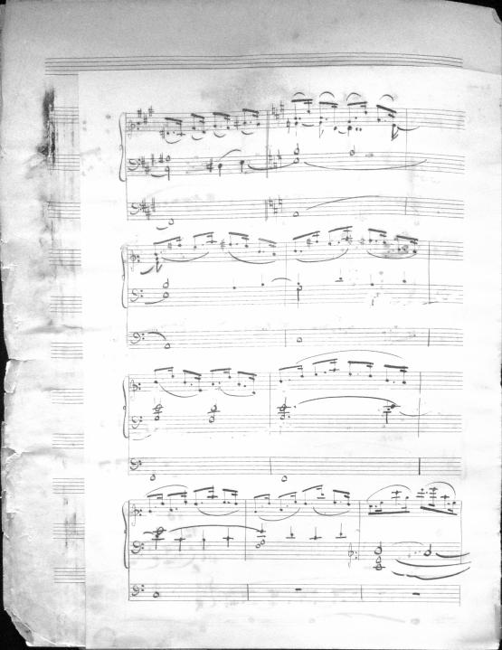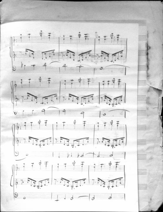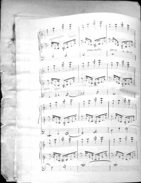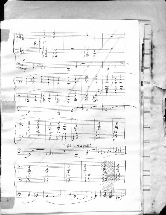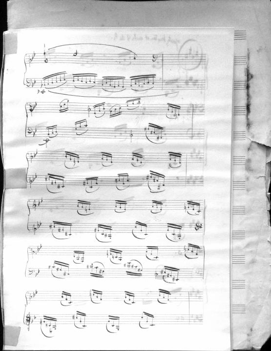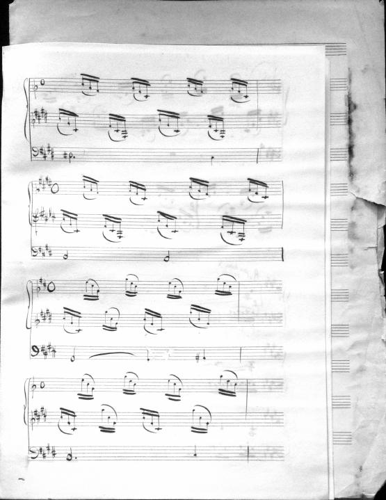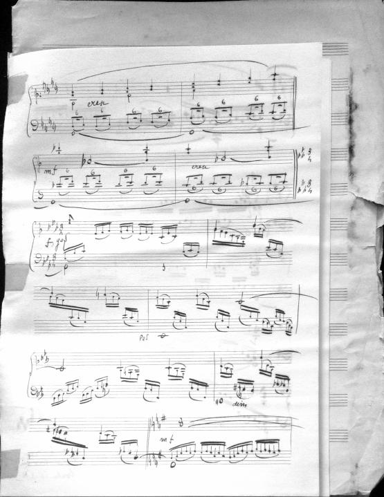 Movements are written in pencil on the front of the score. The manuscript has water damage. Decruck writes her name as "Fernand Breilh"