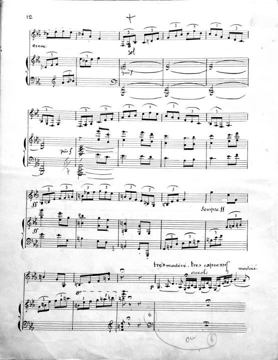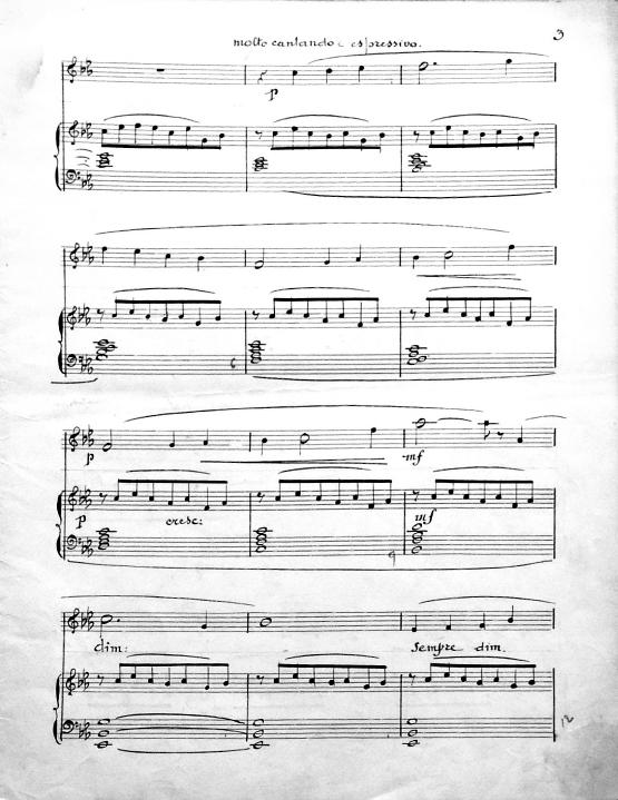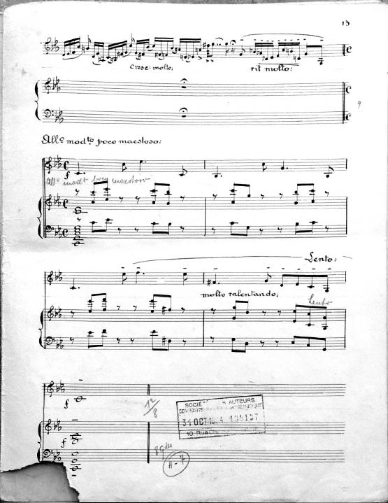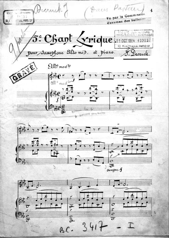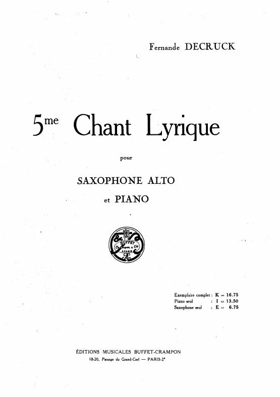 The Chant Lyrique No. 5 for saxophone and piano was first registered with SACEM on October 31, 1934, but it was likely composed in the early 1930’s. Following the success of her first Chant Lyrique, op. 69 (1932), Fernande Decruck continued to compose several short works for alto saxophone and piano. Several of these compositions are titled “Chant Lyrique” and are some of the first works that she wrote for wind instruments. Her interest in the saxophone is most likely attributed to her husband Maurice, who was a double bassist and saxophone player with the New York Philharmonic during the early 1930’s under Arturo Toscanini's baton. In addition, she knew other classical saxophone performers of the time like François Combelle, solo saxophonist of the Garde Républicaine. The form and style of the fifth Chant Lyrique is similar to the first and third. It starts and ends with slow, melodic material, the middle of the work is an interesting exploration of a variety of styles and tempi. Towards the end of the work, there is a short cadenza for the saxophone before the opening material briefly returns to end the work. The three existing versions for saxophone have been recorded by Jean-Pierre Baraglioli.
