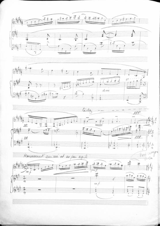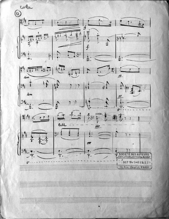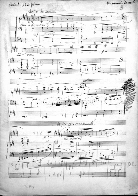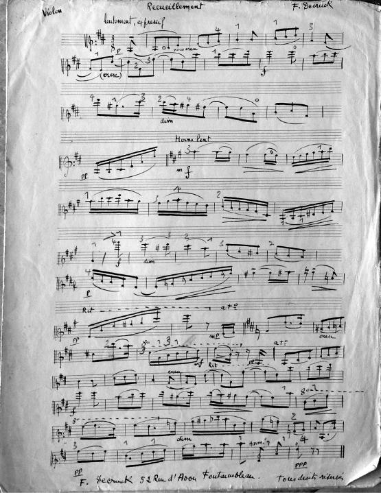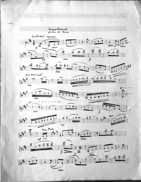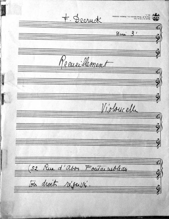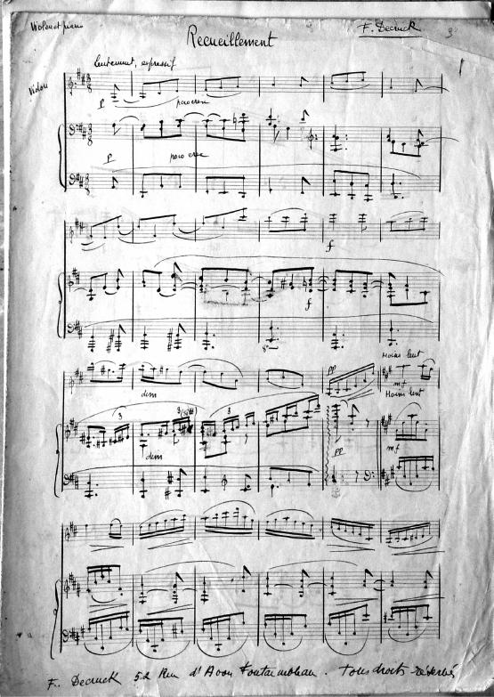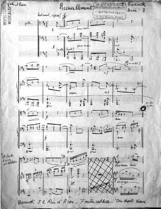 Recueillement means "meditation." In the late 1940's and early 1950's many of Decruck's compositions look to be adapted or written for her son Michel and his friends. Michel was an accomplished violinist. This short work can be played by either violin, cello or clarinet with piano accompaniment.