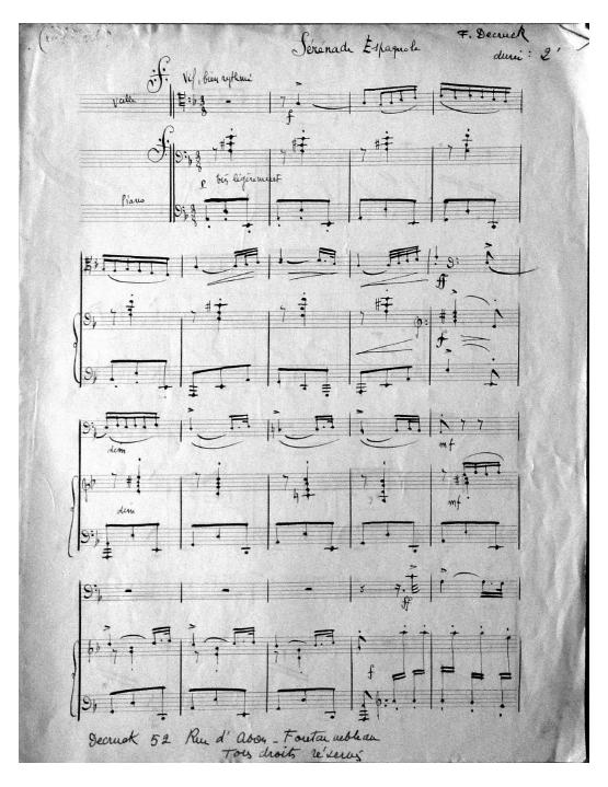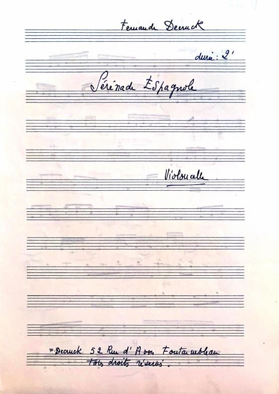 Decruck wrote a series called Les Sérénades. These are some of her last compositions and were written at her last address in Fontainebleau. These pieces may have been used for pedagogical reasons either for her son Michel and his friends or her students at the local music school.